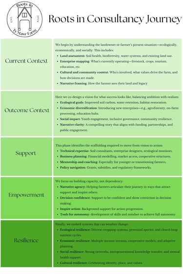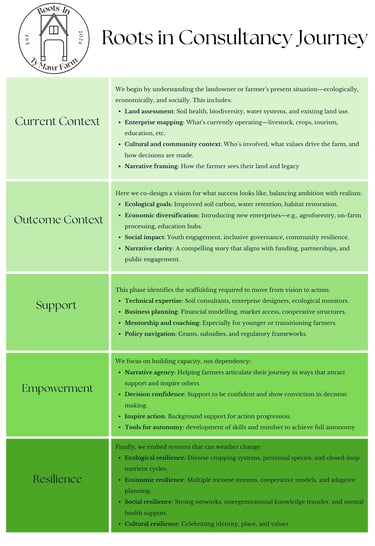 We offer hands-on support to help others embrace regenerative practices that nurture the land and community. Roots In consultancy focuses on environmental improvement and helping landowners understand how sustainable practices can benefit their business, local communities, and long-term land stewardship. A particularly exciting area of work involves supporting new landowners in optimising their farming systems for both environmental and productive outcomes. In some cases, we assist with recruitment and offer remote management solutions. Our involvement in several landscape recovery projects has enabled us to embed regenerative principles into strategic decision-making frameworks ensuring that prosperity, health, and ecological integrity are central to future land use.